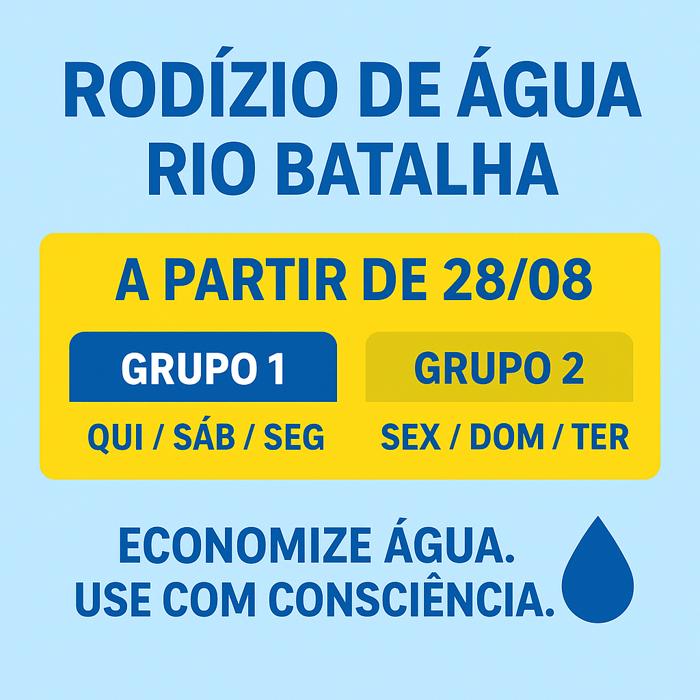 O Departamento de Água e Esgoto (DAE) anunciou a implantação de um sistema de rodízio no abastecimento de água para os bairros atendidos pela Estação de Tratamento de Água (ETA) do Rio Batalha. A medida passa a valer a partir da meia-noite desta quinta-feira (28) e é uma ação emergencial diante da queda no nível da lagoa de captação, resultado da estiagem prolongada.